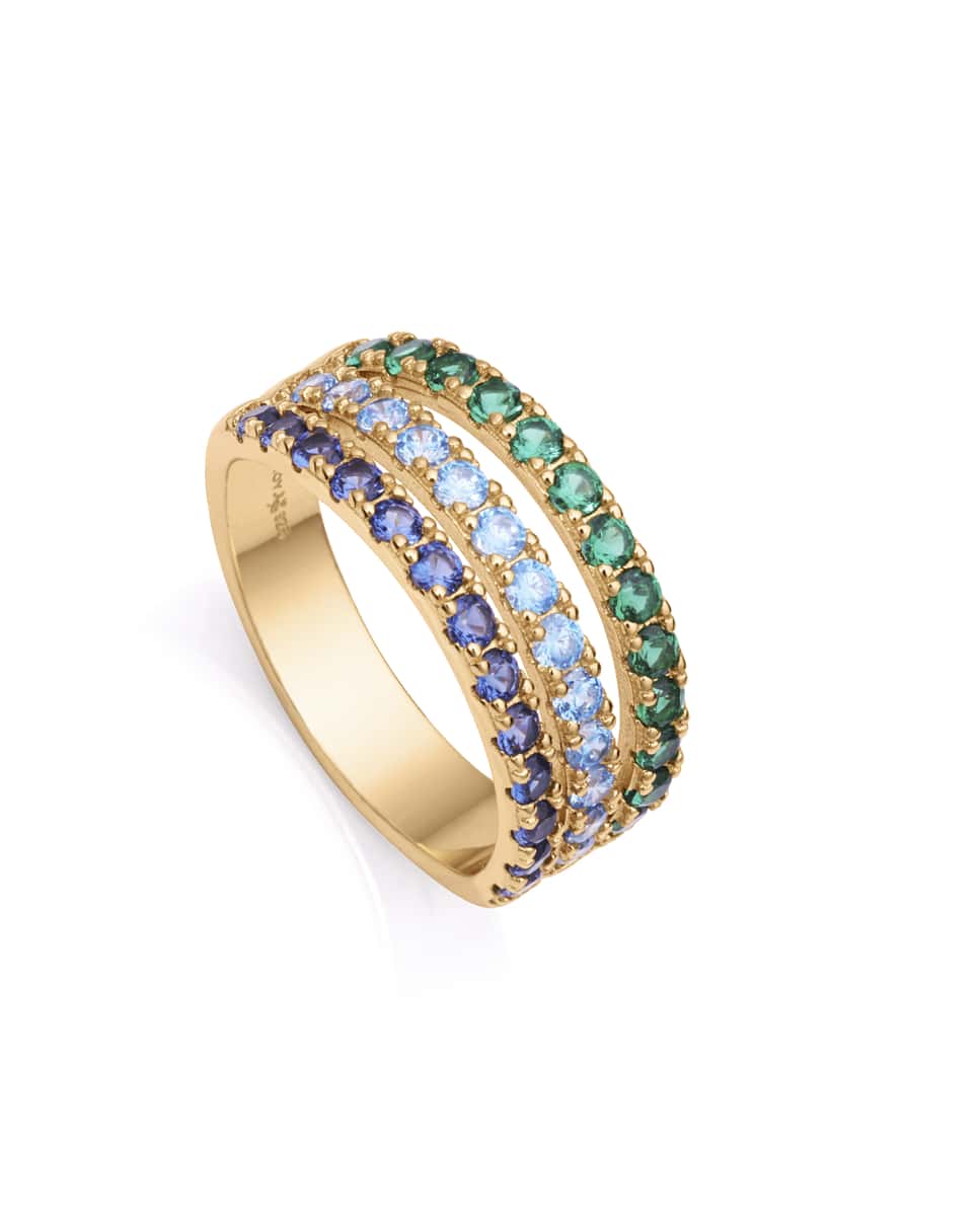 Anillo Viceroy 13136A012-39 tres filas de circonitas está orientado para mujer. Es de plata de ley 925 ML chapado en oro amarillo, con tres filas de circonitas en azul , azul claro y verde. Talla: 14. Acabado: Brillo/pulido. Este diseño atraerá todas las miradas. Disfruta de tu anillo Viceroy