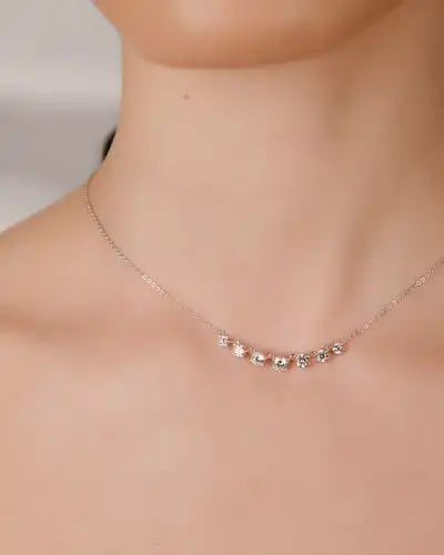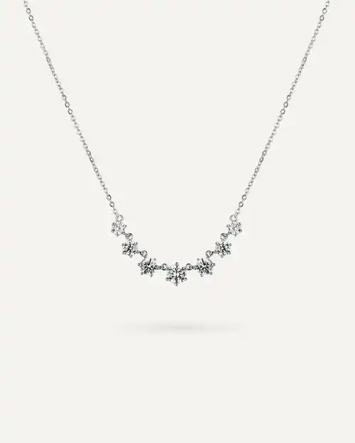 Collar en plata de ley 925mls con doble baño de platino y rodio y circonitas EXCELLENCE STAR CUT talladas con los estándares ideales del corte brillante. Ofreciendo el máximo brillo habiendo utilizado el corte ideal de Tolkowsky, reconocido como el corte brillante más perfecto del mundo.
