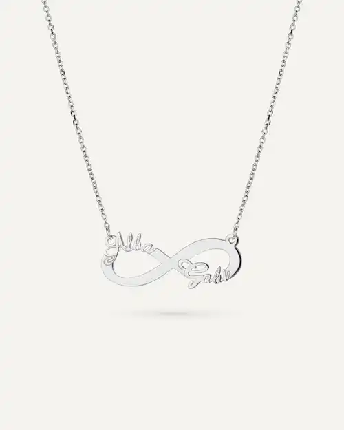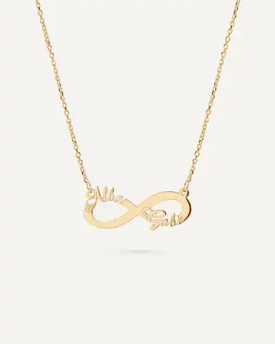 Ideal para parejas o para simbolizar un lazo muy fuerte entre dos personas. Este collar con símbolo de infinito y dos nombres es una joya emocional que trasciende el tiempo.