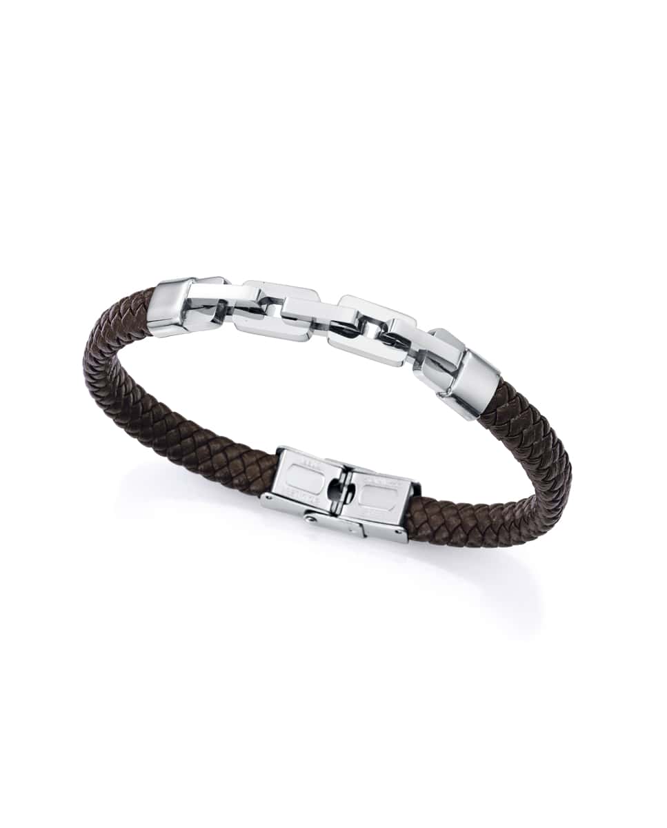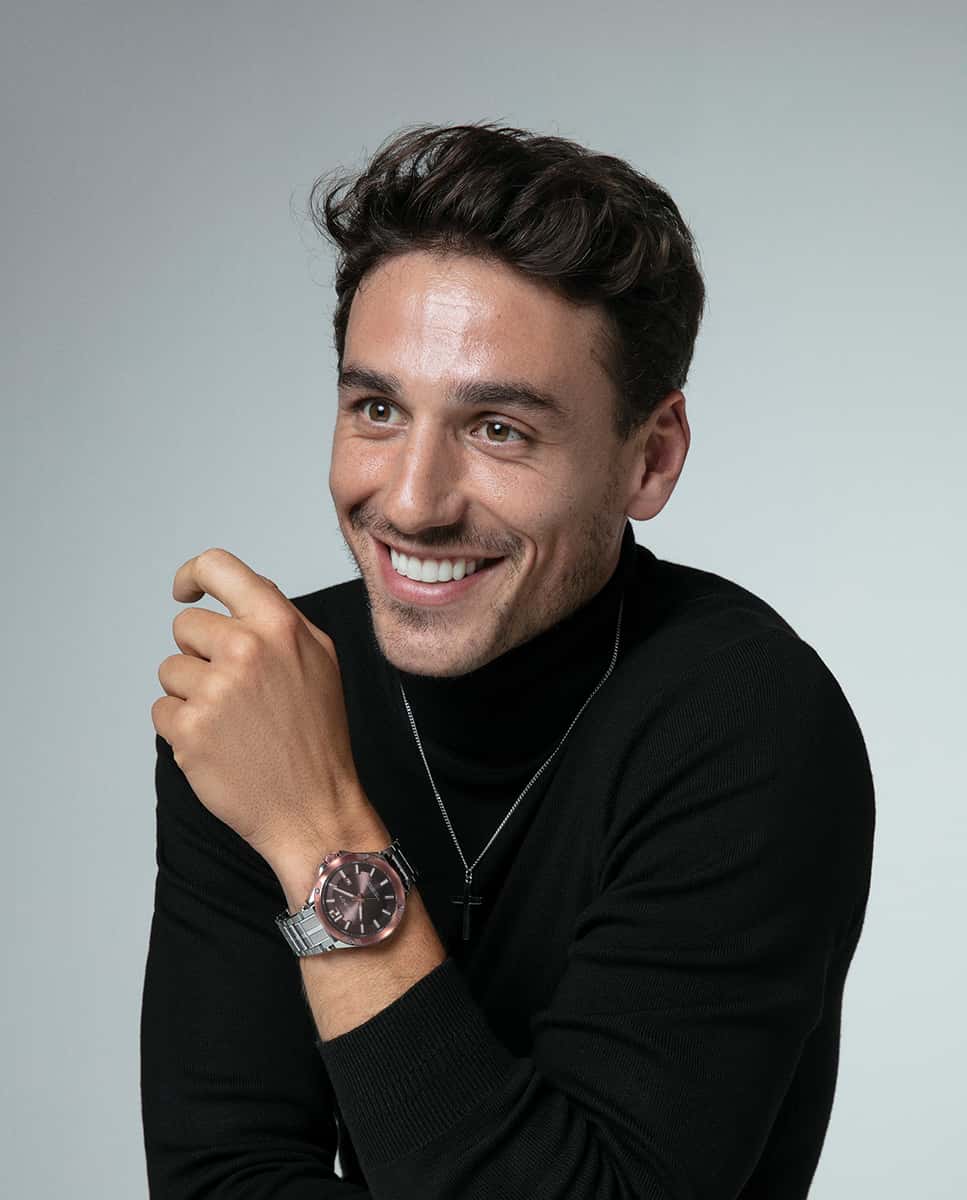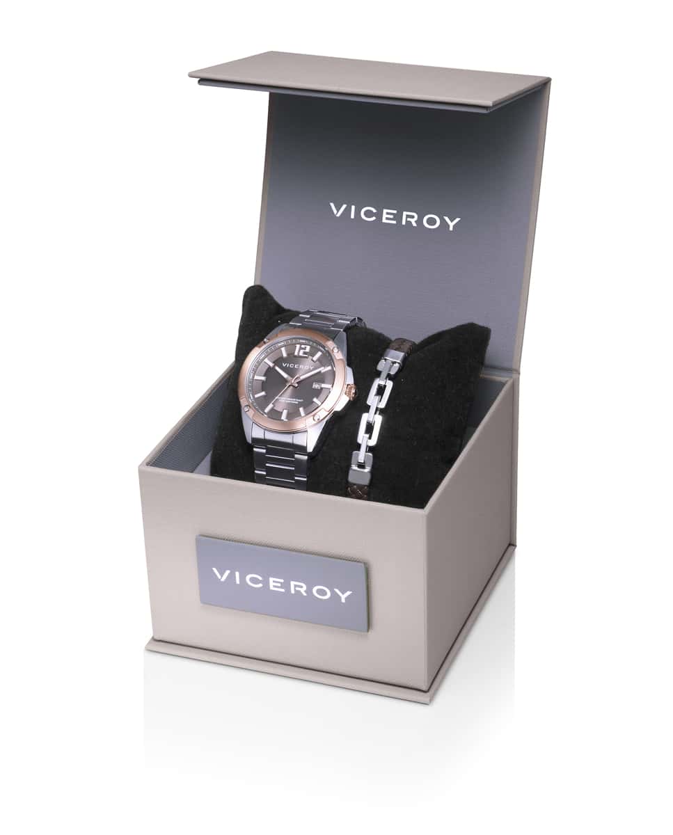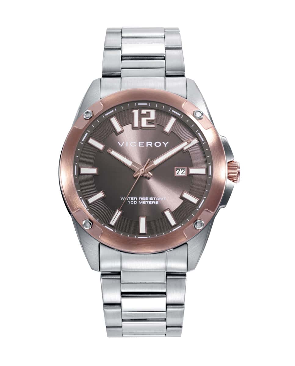 Pack reloj de hombre tres agujas con calendario a las 3 caja bicolor acero Ip rosa con tornillos decorativos en la caja 10 atm y brazalete de acero con esfera gris e indices con agujas horarias en color rosa, cristal mineral. Pulsera de acero de piel marrón