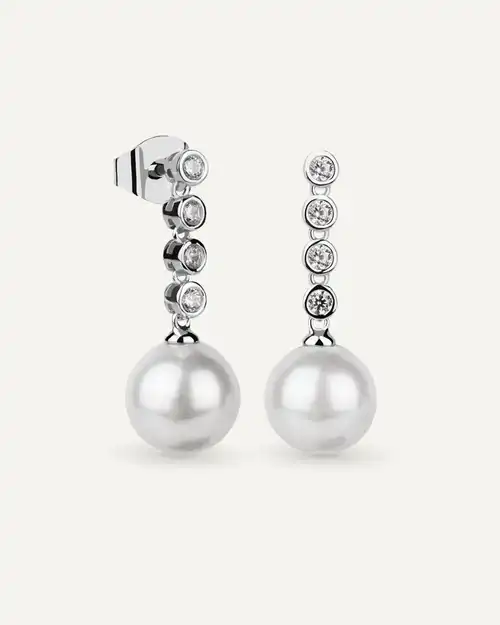 Pendientes en plata de ley 925mls con doble baño de platino y rodio y circonitas EXCELLENCE STAR CUT talladas con los estándares ideales del corte brillante. Ofreciendo el máximo brillo habiendo utilizado el corte ideal de Tolkowsky, reconocido como el corte brillante más perfecto del mundo y perla de concha con núcleo de nácar recubierto por una mezcla fina de polvo de nácar.