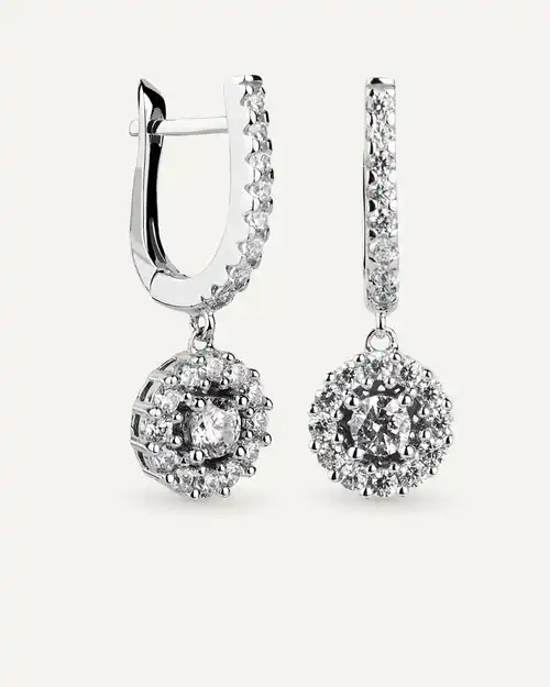 Pendientes en plata de ley 925mls con doble baño de platino y rodio y circonitas EXCELLENCE STAR CUT talladas con los estándares ideales del corte brillante. Ofreciendo el máximo brillo habiendo utilizado el corte ideal de Tolkowsky, reconocido como el corte brillante más perfecto del mundo.