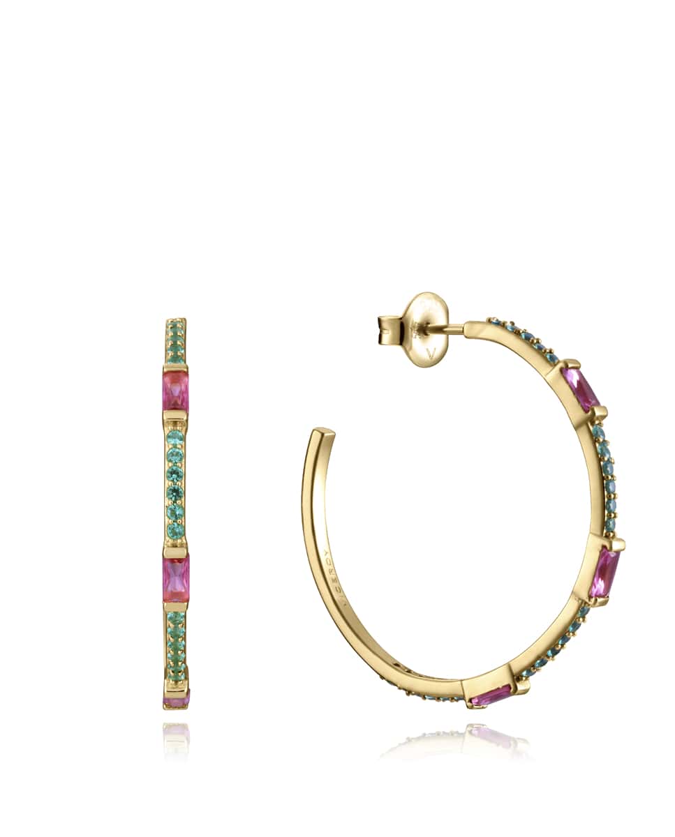 Pendientes dorados con circonitas de color verde y rosa, con un diámetro de 3 cm. Una joya con un toque exótico que encajará perfectamente en tus looks más variados. Solo los encontrarás en la colección de Viceroy, las joyas de plata más distinguidas y exclusivas. Diámetro: 3 cm.