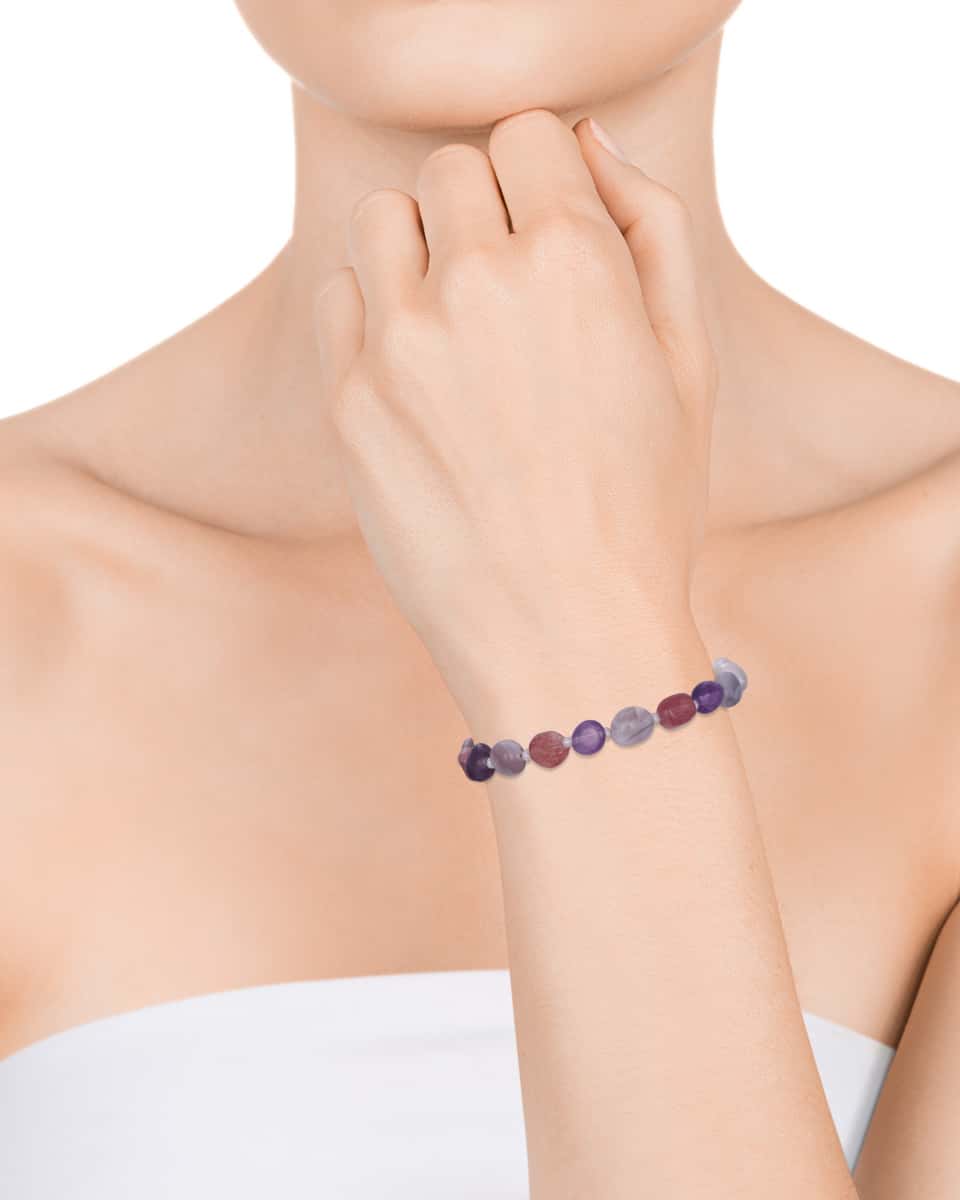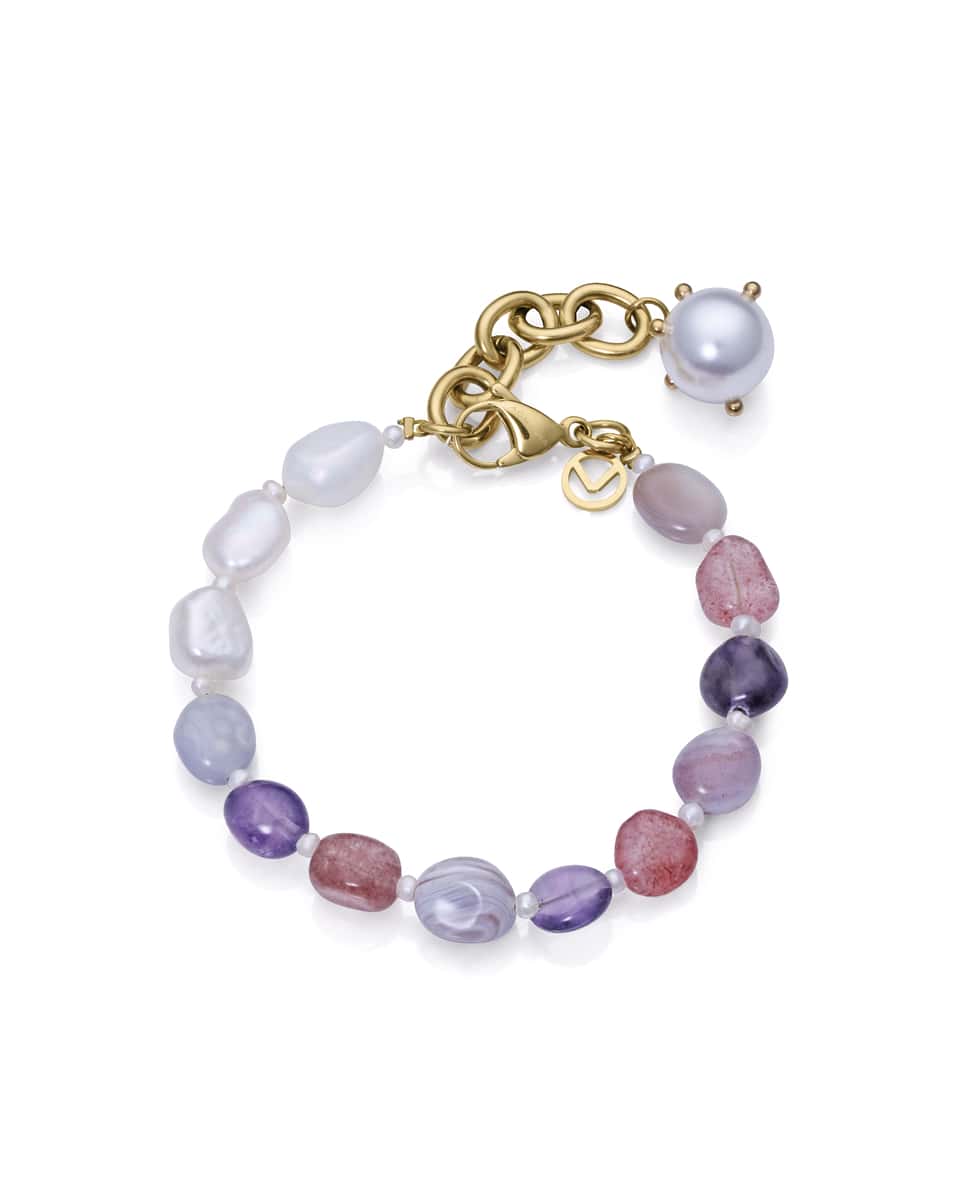 Pulsera fabricada en acero ip dorado con piedras moradas y perlas.