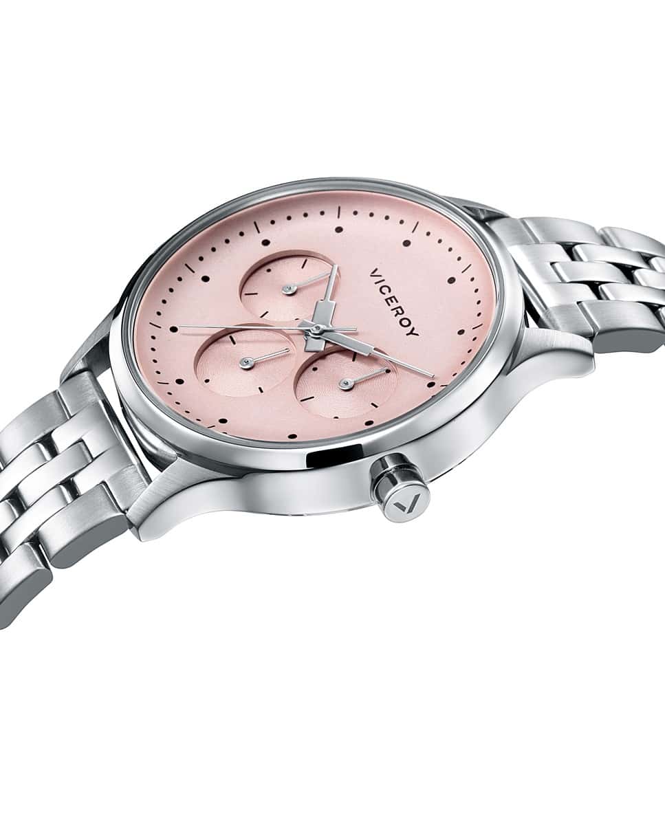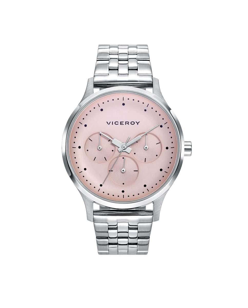 Reloj Viceroy 461126-96 reloj pulsera multifunción colección Switch para mujer Reloj Viceroy para mujer con caja y brazalete de acero. Esfera en color rosa con agujas e índices en plateado.. Tres esferas multifunción con agujas en plateado. Brazalete en acero con cierre desplegable doble pulsador Viceroy de seguridad. Fondo cerrado a rosca Tamaño de reloj para mujer con medida de 37 milímetros. Resistente al agua. Presentado en Estuche Original → Garantía Oficial Sellada (2 años)